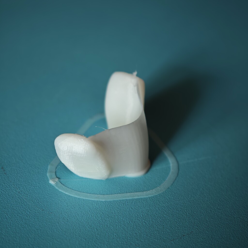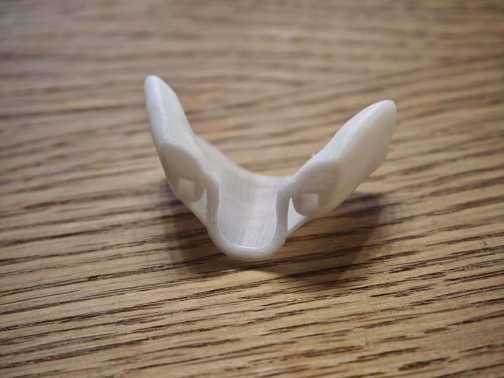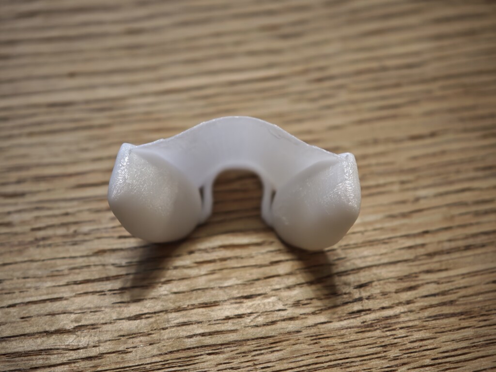 また、2つをつなぐ接続部分ははめるときに内側に反転して飛び出さないようにしました。付けた感じは安定していてすぐ取れそうになかったので切っても大丈夫だったかも。ちなみにTPUはかなり強い素材で、劣化しなければちょっと引っ張ったくらいでは切れません。肌あたりもやわらかいですし非常にこの部位には向いている素材だと思います。シリコンは現状3Dプリントできませんからね(先日PRUSAから発表がありましたが!)