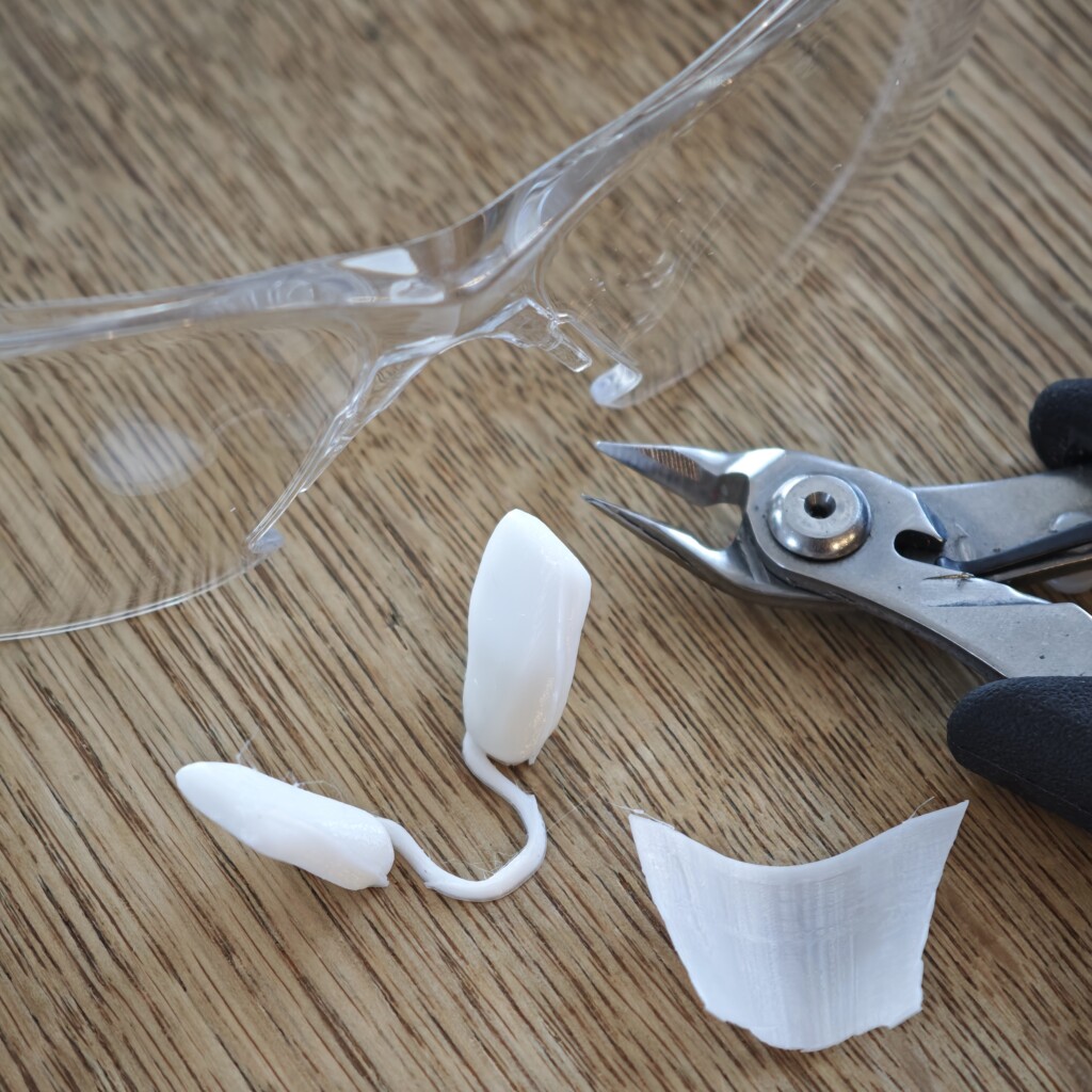 鼻あては左右をつなぐ形状を作るとともに、印刷する際の安定性を考えて後から切除する捨て形状を作成しました。もともとが小さいモデルですし、接地面も大きくなく、素材もTPUでゆがみやすいので、印刷時の安定性は大事です。また、印刷時のノズルパスを考えると、TPUなので左右のパッドをつなぐ部分に糸引きが出てきてしまいます。捨て形状があることで両側パッドの間をブリッジせず、ノズルパスを鼻パッドの外に逃がすことが出来ます。3Dプリンターを使う上でのこういった小さい工夫、意外とあるんですよ。