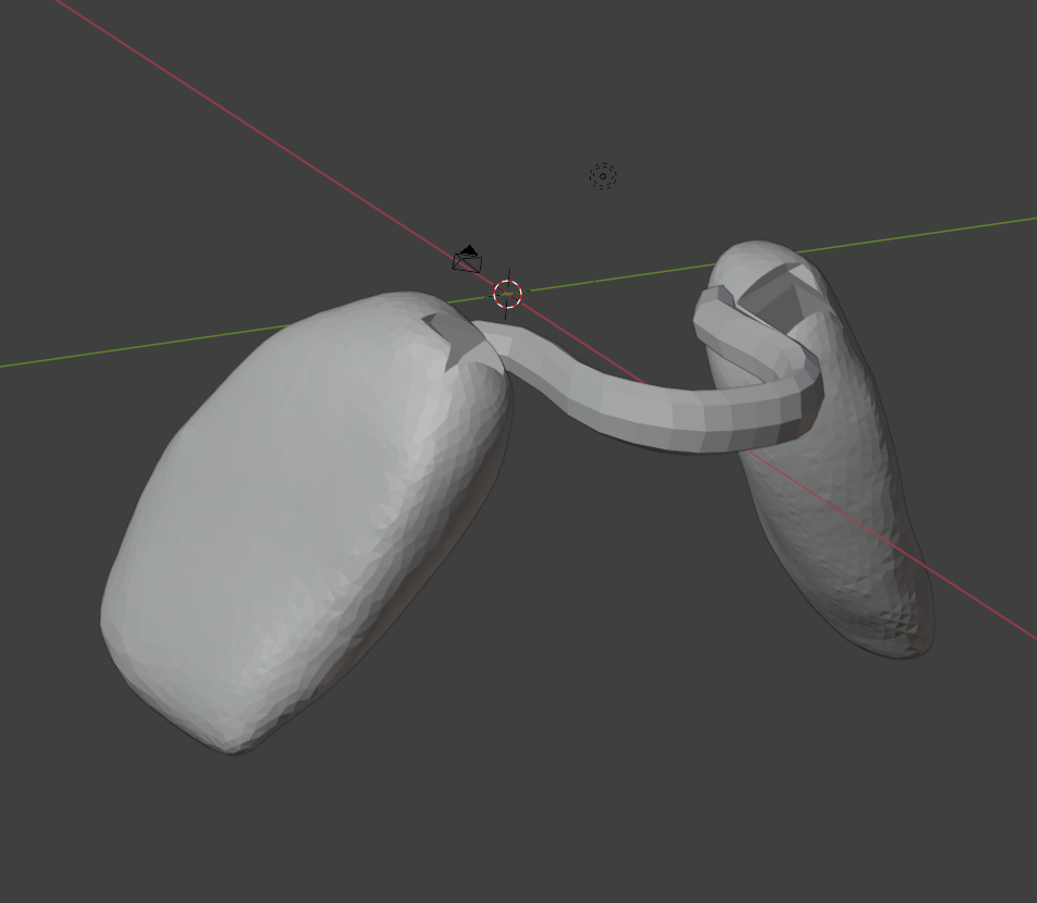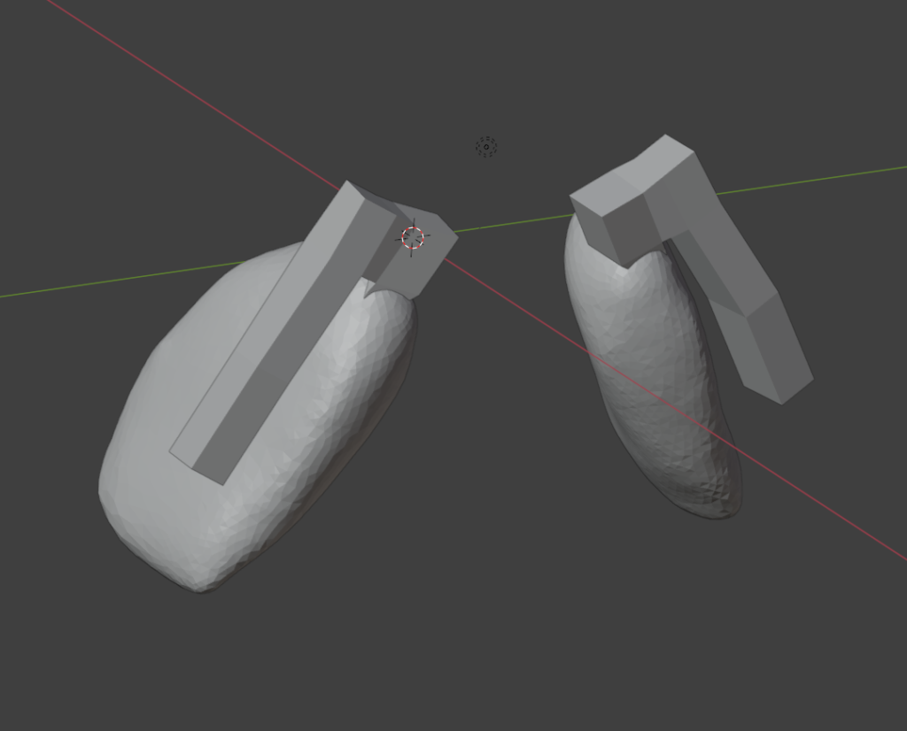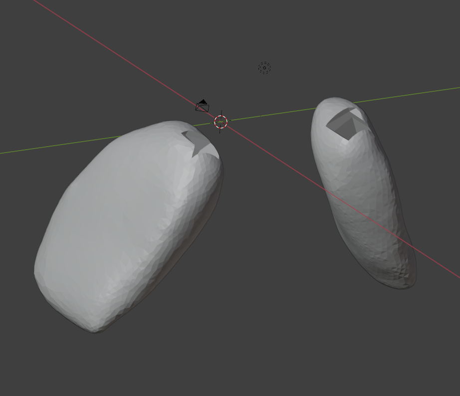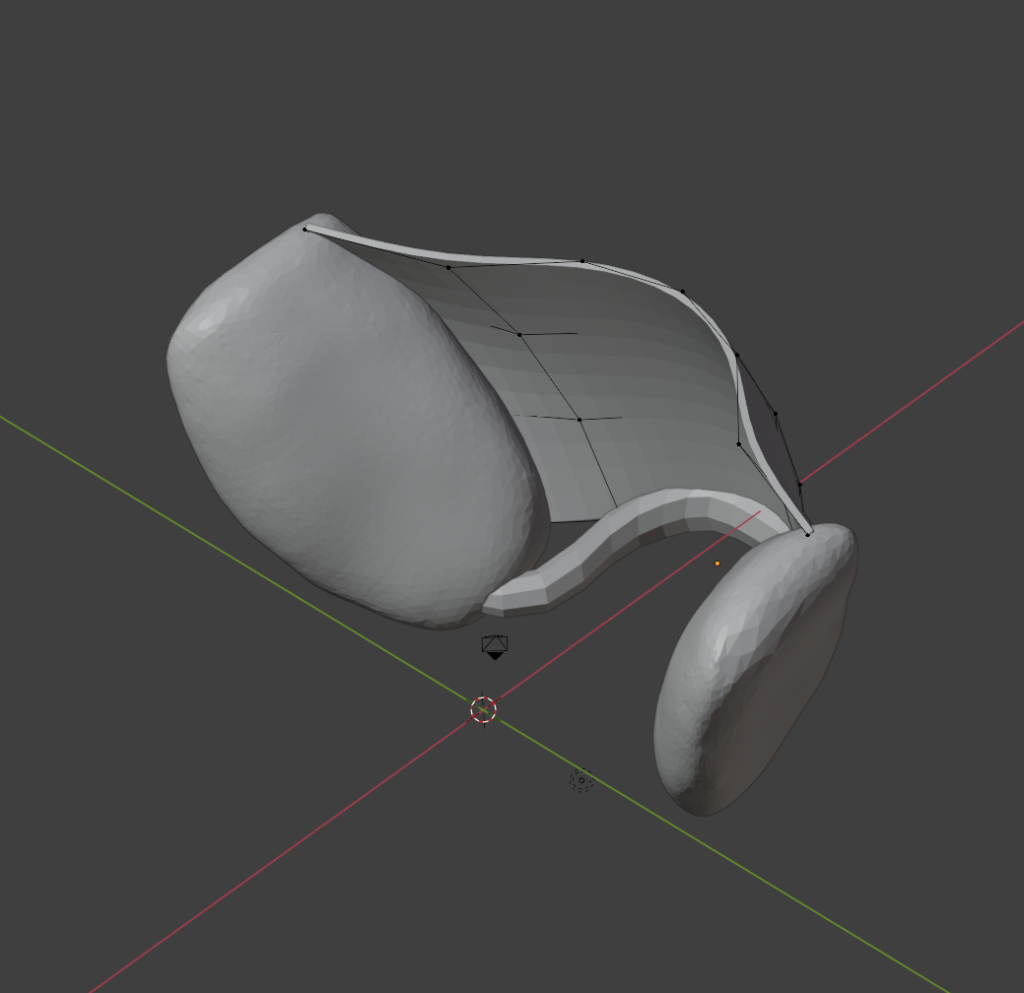 これをobj形式でダウンロードして今回はBlenderに持っていきます。CADで作る方法でももちろんいいのですが、今回は寸法等は関係ないですし鼻に当たる部分ということで、修正しやすさを考えてもCADで行う必然性が低いと思います。ということで、今回はBlender上でこの形状をもとにブーリアン用のくりぬき部分を作成しておき、左右対称に干渉しないサイズでスカルプトを用いて(適当に)鼻あて形状を作りました。