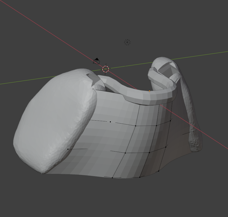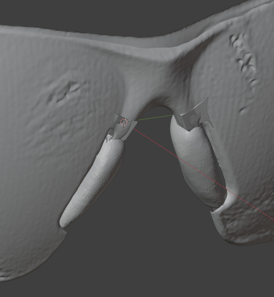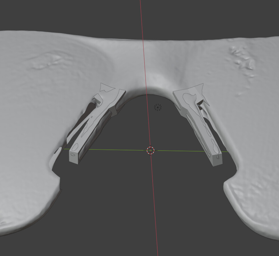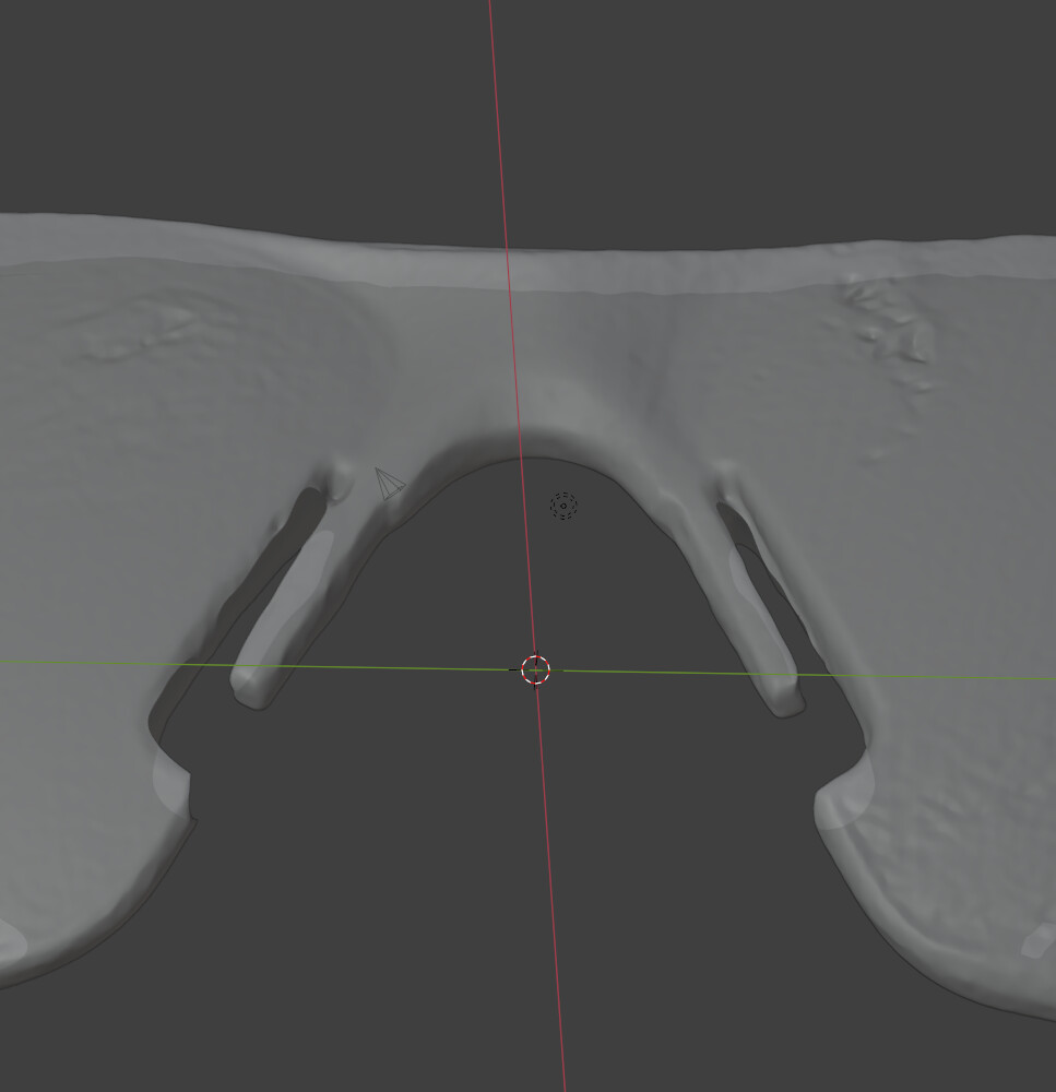 これをobj形式でダウンロードして今回はBlenderに持っていきます。CADで作る方法でももちろんいいのですが、今回は寸法等は関係ないですし鼻に当たる部分ということで、修正しやすさを考えてもCADで行う必然性が低いと思います。ということで、今回はBlender上でこの形状をもとにブーリアン用のくりぬき部分を作成しておき、左右対称に干渉しないサイズでスカルプトを用いて(適当に)鼻あて形状を作りました。