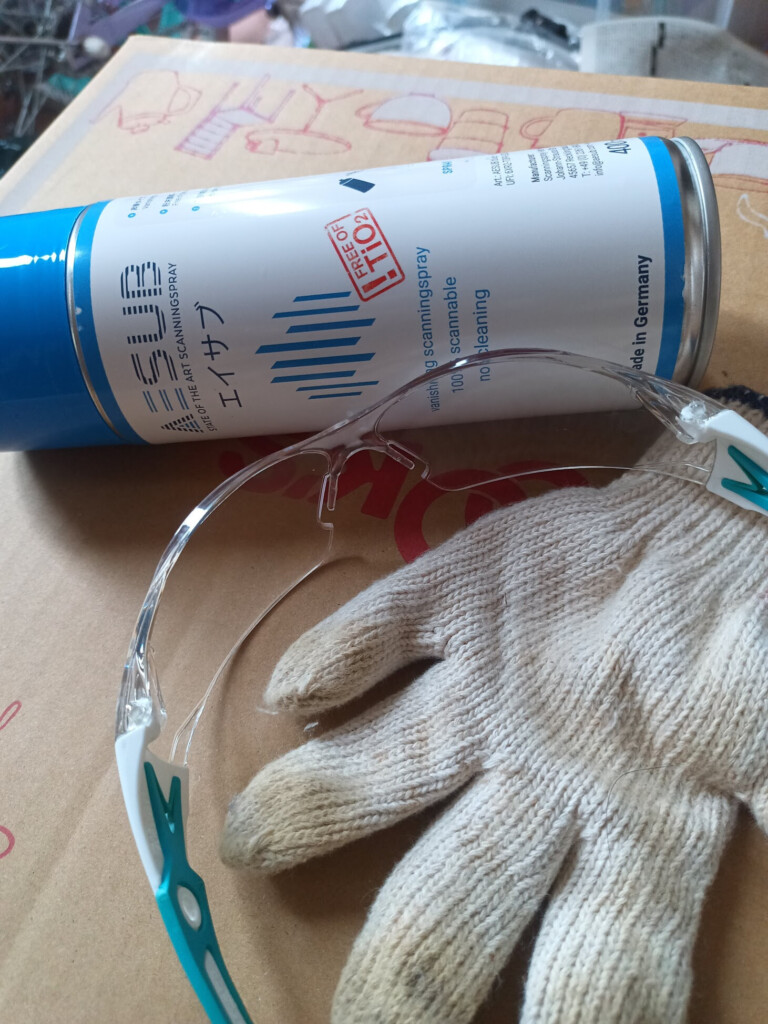 実際にスプレーしてみましょう。こんな感じでスキャンが可能になります。黒いものなどでも使えますし少なくとも私の知る範囲では使えない素材はなかったです。(精密機器などは試したことはありません)。めちゃざらっとした灰色になるんですよね。本当にすごい。これでスキャンし放題です。欠点といえば、スプレーからちょっと変なにおいがします。昇華中もちょっとにおいがするので換気には気を付けたほうがいい気がします。マスクと手袋はしておいたほうが無難です。ちなみに、スキャン翌日朝には消えていました。(3枚目)