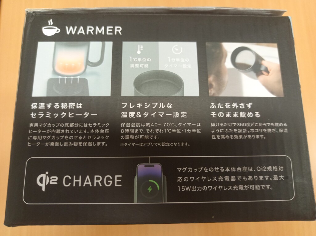 基本的にはqi2充電器に専用のマグカップ(セラミックヒーター内蔵)を載せるとモードが切り替わって保温出来る、という感じかなと思います。詳細は記載されていませんが、IHのような無線給電でセラミックを温めていると思います。PTCセラミックかな?