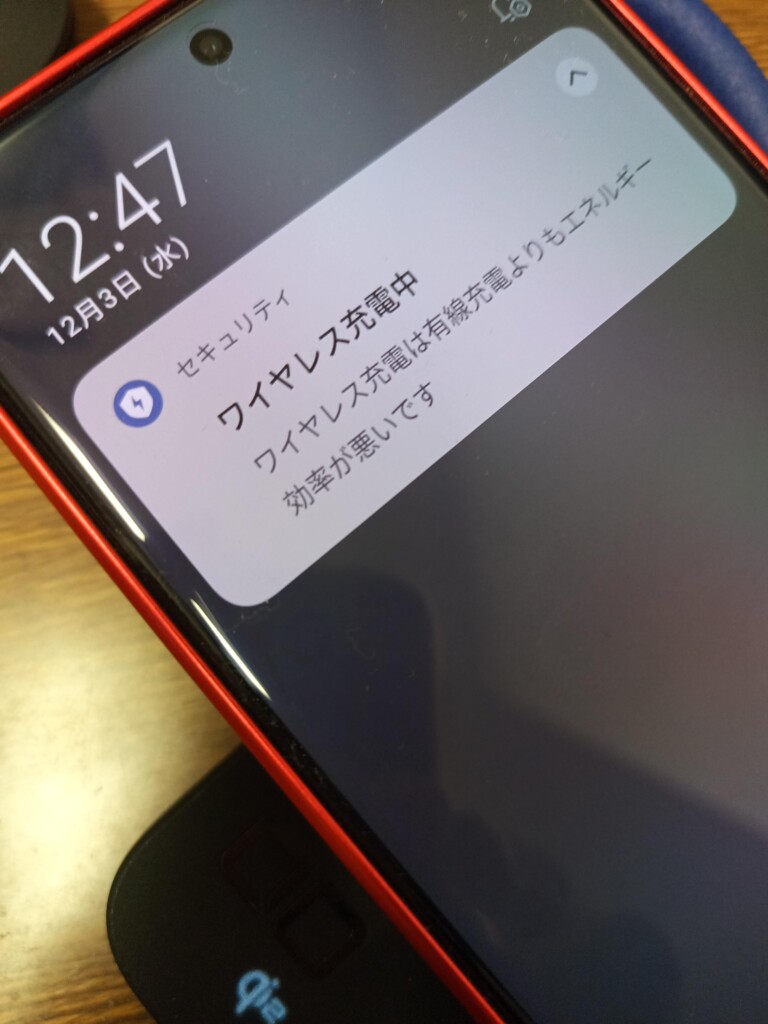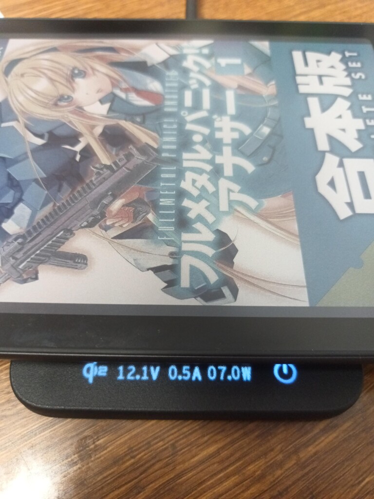 では充電機能の方です。私の手元にあるのってKindleとXiaomiのスマホくらいなのですが、もちろんどちらも充電可能です。qi2の充電器は色々ありますが、充電器としての性能は平凡です。まあ規格そのものがそれほど大したことはありませんが、12V、15Wまでとなります。写真のようにKindleは7w、xiaomiは12W程度で充電されています。xiaomiはわざわざワイヤレス充電は効率悪いよ、と表示までしてくれました(笑)。