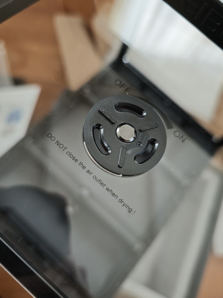 本体は組み立て式です。よくある製品とちょっと違って、ベースの本体に透明な蓋を上からかぶせる形です。上面には持ち手がりますが蓋を外すためのものです。上面には排気口があり、乾燥時は手動で開けておくことになります。ディスプレイはシンプルで操作に困ることは無いと思います。