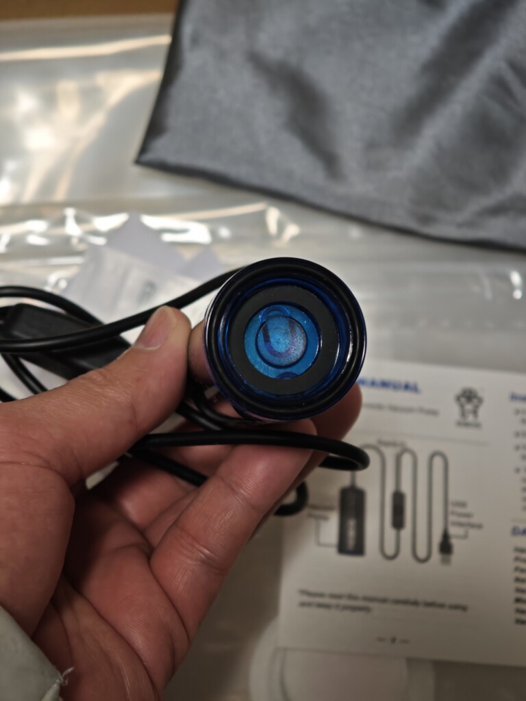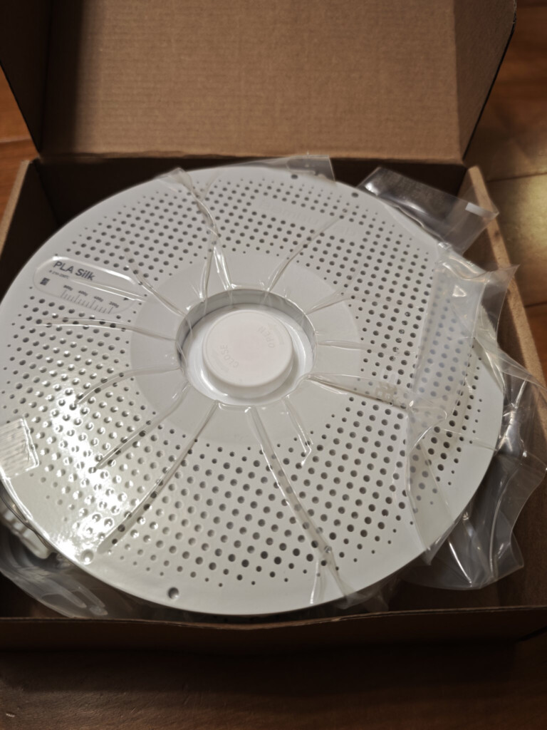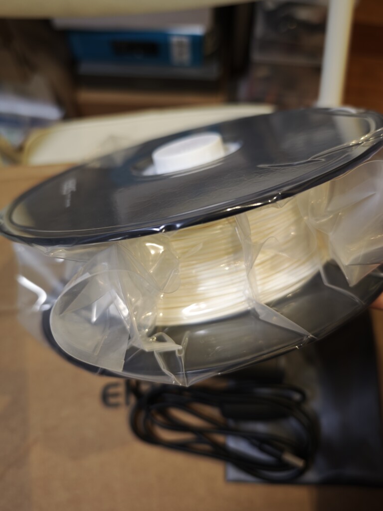 確かになぁと試しにやってみるとスプール穴径がBambu互換くらいあれば最初から穴の内側にこの真空ポンプ接続部を押し込んでおくことで平たく密閉することが可能で、フィラメント元箱にもちゃんと収まりました。シンプルで非常に良いのと、機材提供いただいてから2か月間シール後放置したフィラメントがこちらです。少なくとも空気の流入はほぼシャットアウトされており、真空パック状態が保たれています。