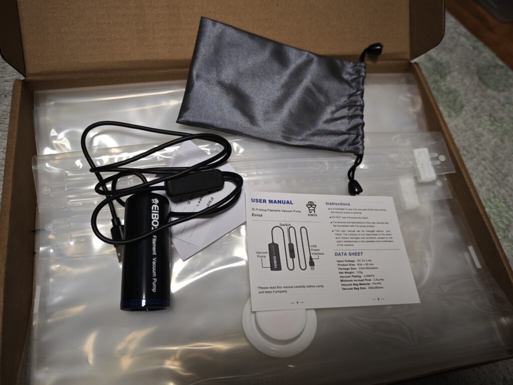 セットでご紹介するEURUSは、乾燥させたフィラメントを最適な状態で保存するための真空パックのシステムです。USB接続の吸引機と専用バッグのセットで、フィラメントを入れてからバッグを閉じ、USB吸引機で真空パック化します。もちろんバッグだけの追加購入もできます。