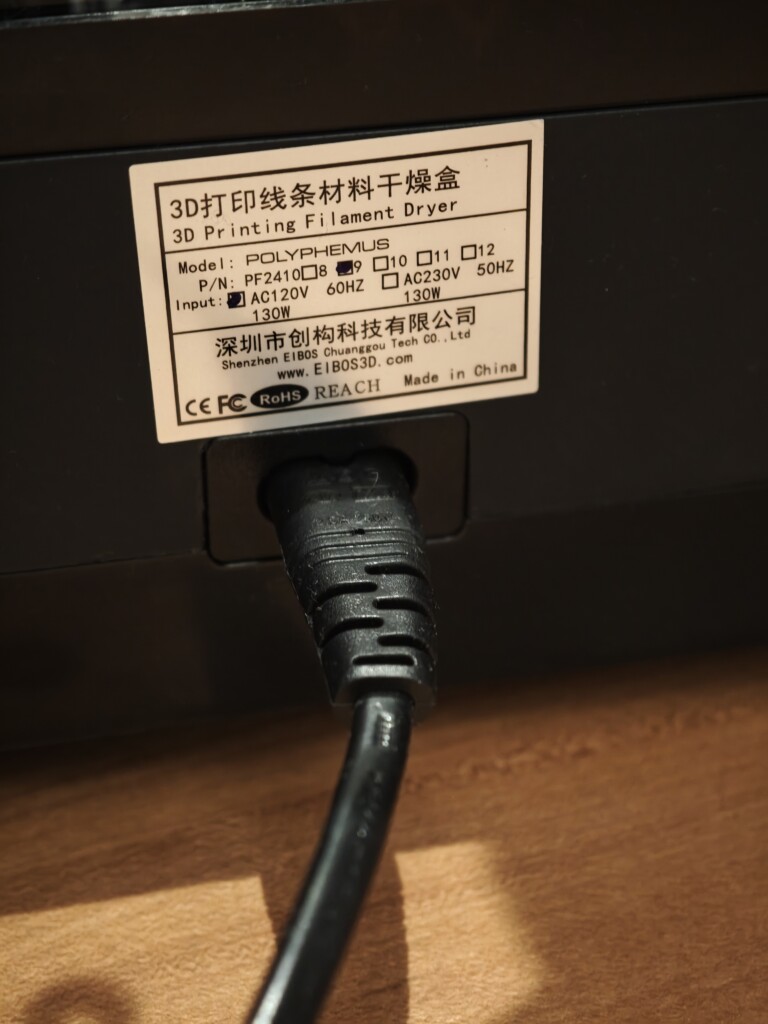 今回提供いただいたPolyphemusはマイナーチェンジ後の最高80度対応のものになります。ヒーター等がパワーアップした結果とのことで、80度という温度は乾燥には不要だと思いますが、この温度だとPLAのアニール処理に使えるのではないかと思います。フィラメントサイズまでのPLA造形品なら印刷後80度でアニール処理すれば耐熱性等樹脂の特性向上が行えるかもしれません。先日出たpolymakerの耐熱PLA等に向いていそうです。