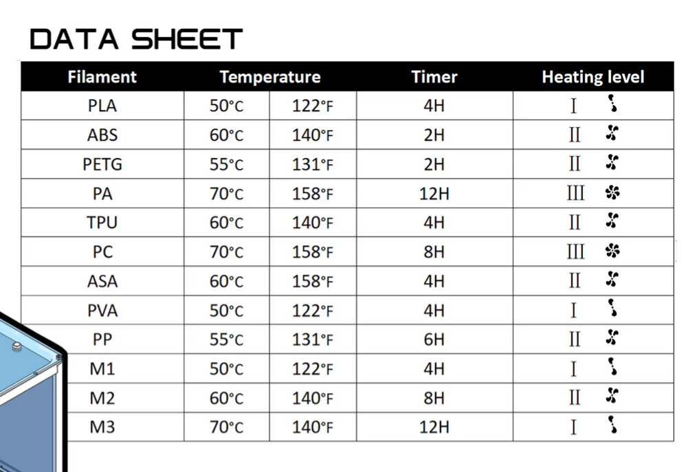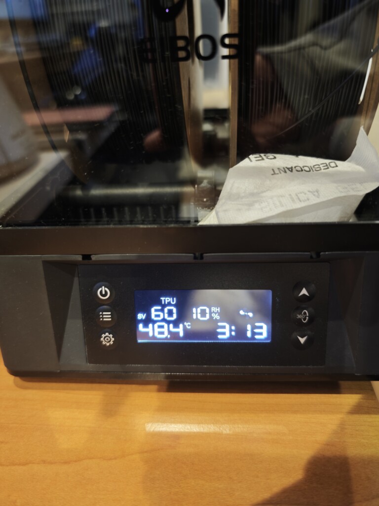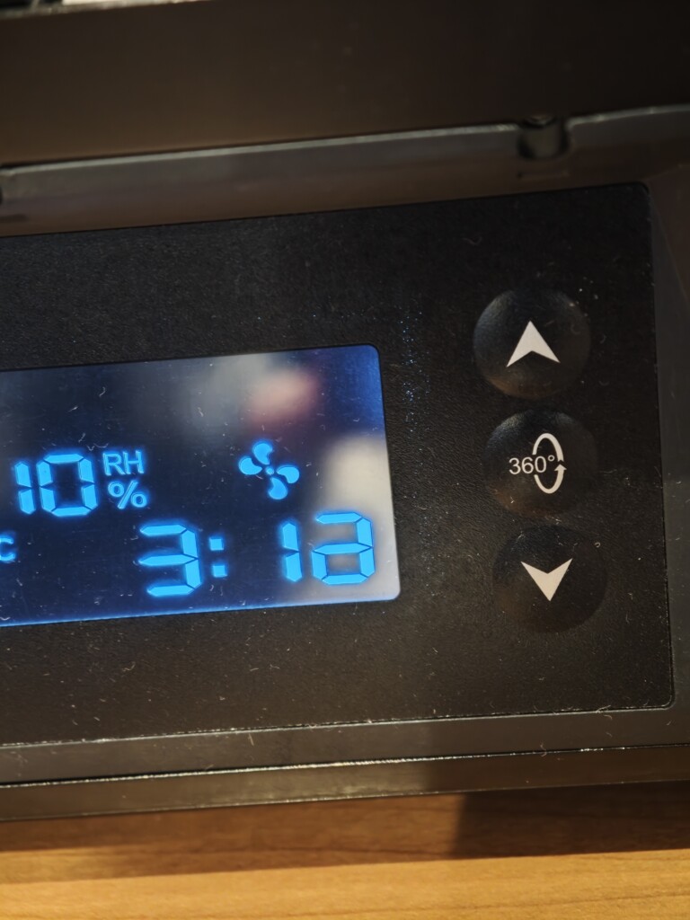 ただHeating levelは外気温によって左右されます。冬場の寒い室内ではこの設定でPLAを乾燥させても50度まで到達できません。循環方式ではないので周囲が寒ければ上部のベントを少し閉じ気味にしたり、Heating levelを少し上げたほうがいいです。ただ、47度くらいで平衡状態になったとしても、内部の除湿は行えていました。必要に応じて手動で調整するのがいいと思います。