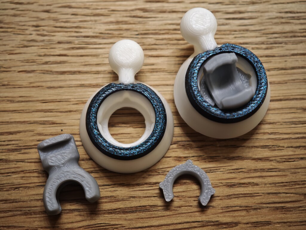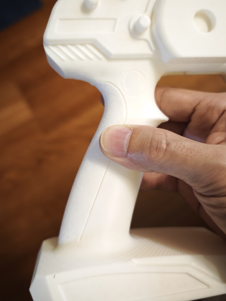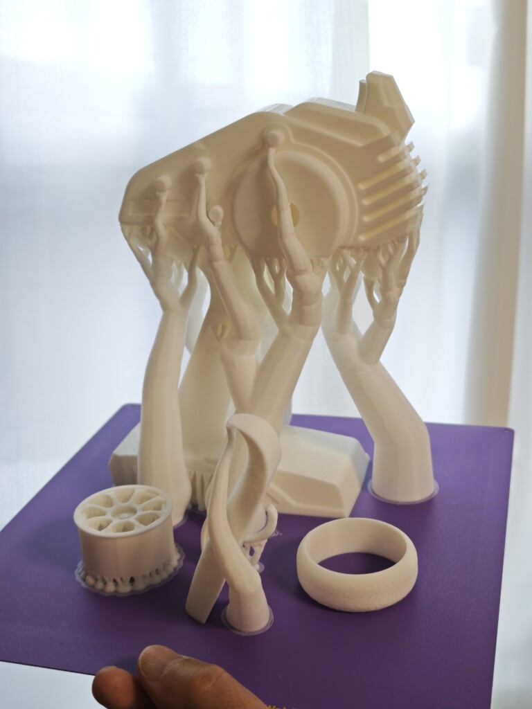 PhaetusのConwebプレートを使用していますが、がっちりくっついて安定印刷されました。オーバーハングやtreeサポートのきれいさがわかります。寸法安定性も非常によく、全体手前のグリップ部分と本体の嵌めあいも正確で印刷時の寸法誤差は少ないでしょう。treeサポートに乗っている形状がきれいなのが大きいかも。