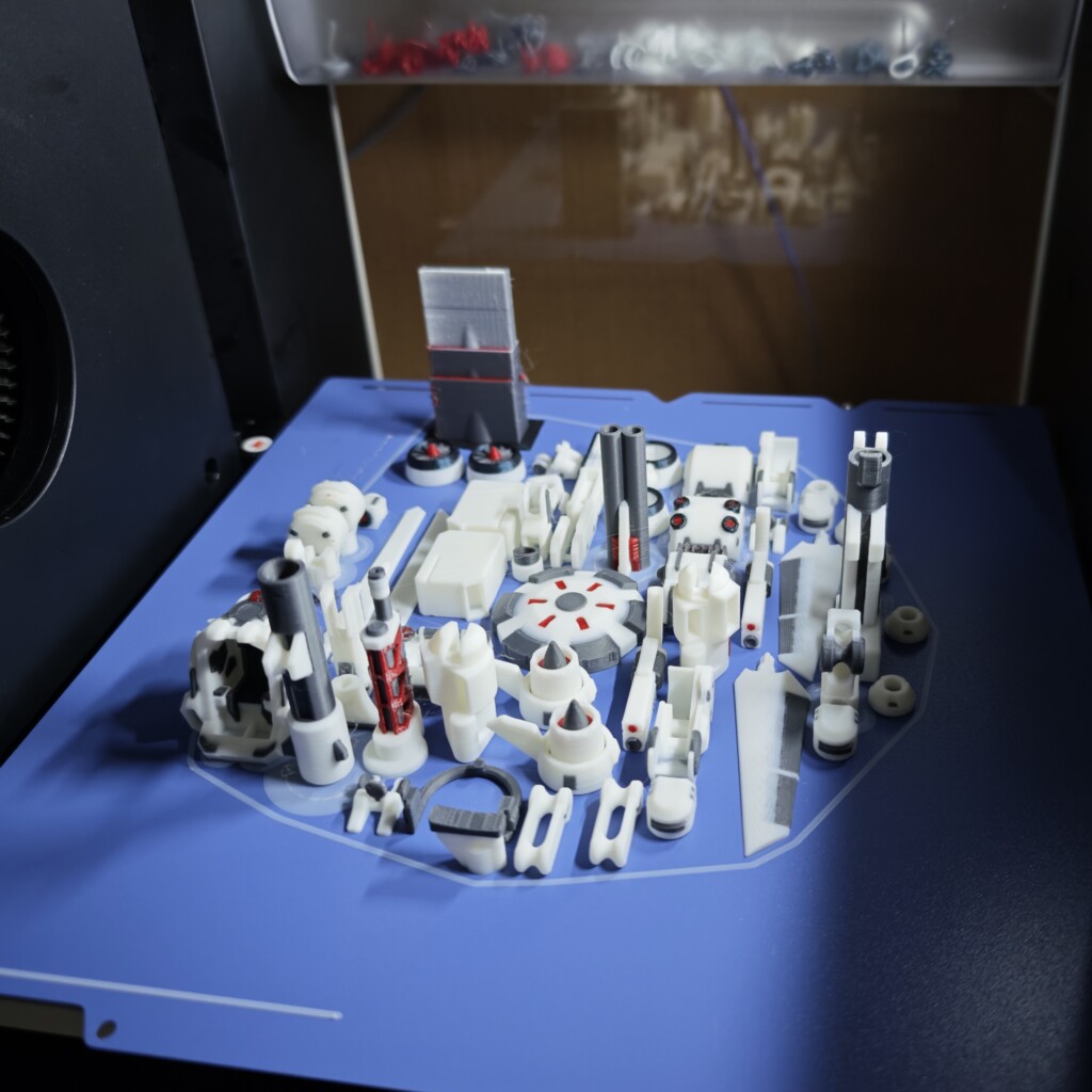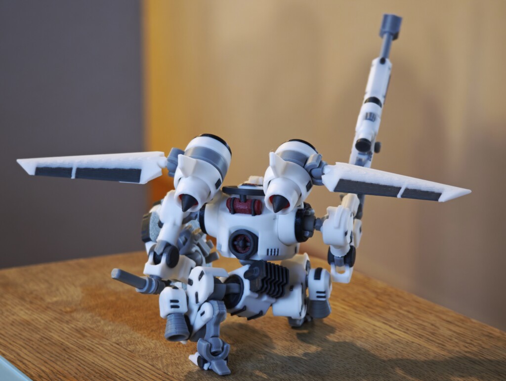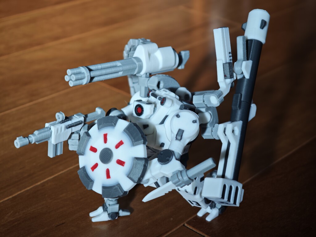我が家では先日お伝えしたSnapmaker U1 で4色フルに使用し印刷を行っています。嵌めあい部分の灰色はABSで、それ以外がPLAで2回に分けての印刷です。白のGENESIS、ご覧の通りかなりきれいです。白い部分のはめ込みも適度に硬く、少なくとも私の印刷条件では133%でご覧のように様々なポーズをとらせることが出来ました。(相手はABSなので関係ない部分もあります)Snapmaker U1 についてはぜひこちらも。