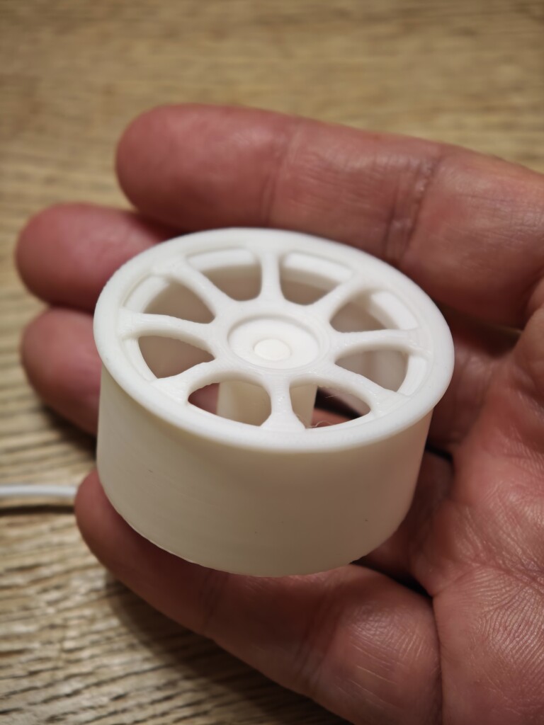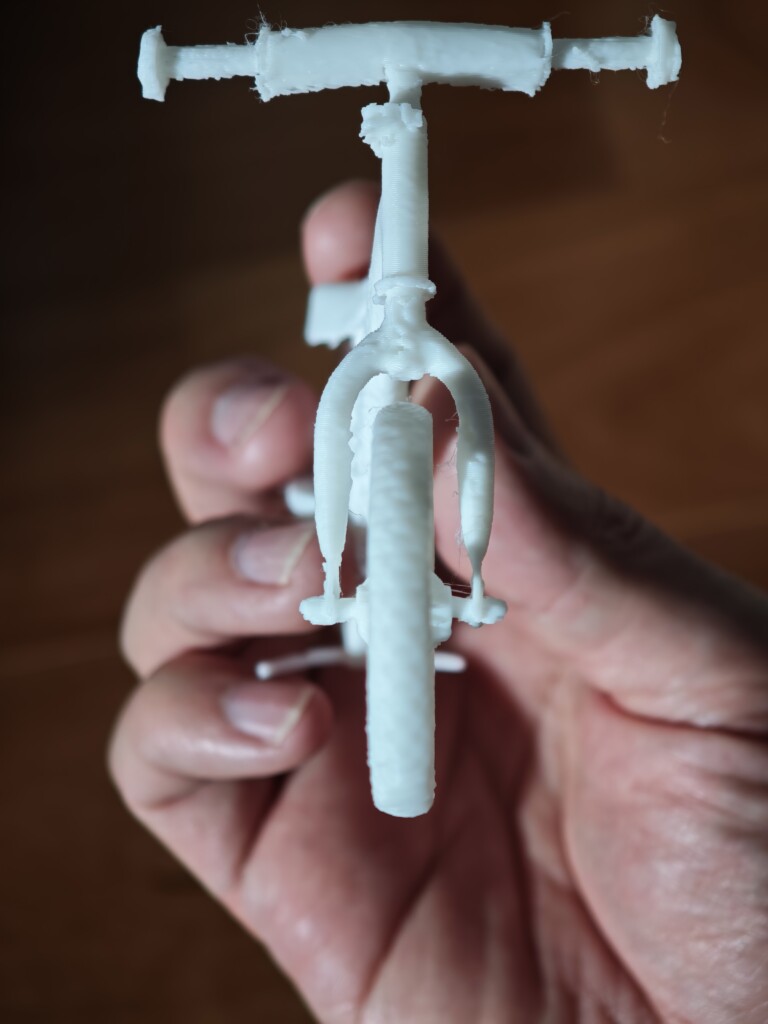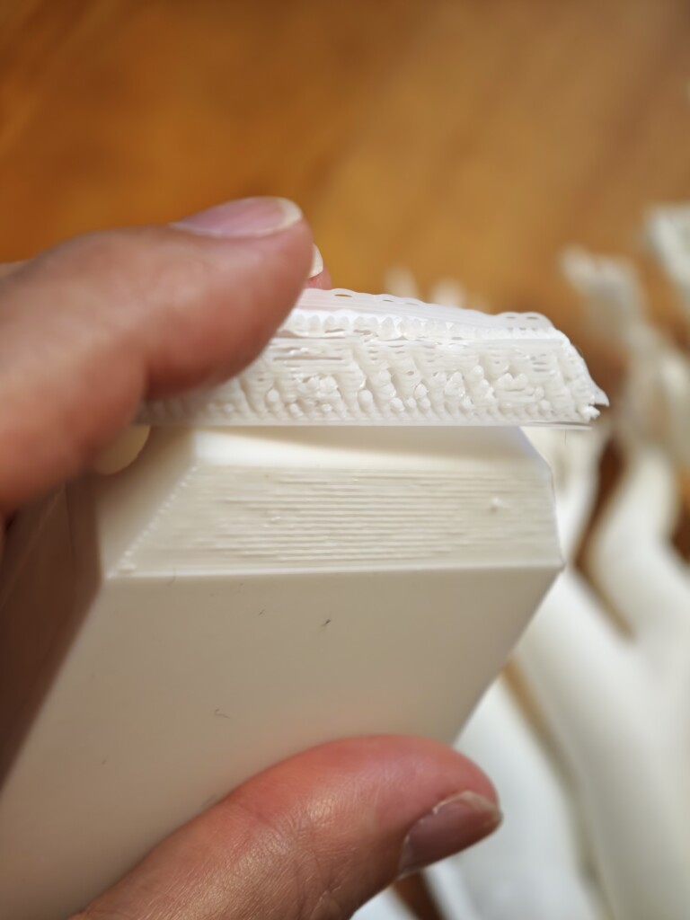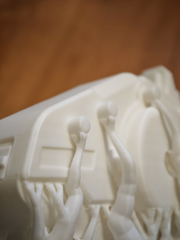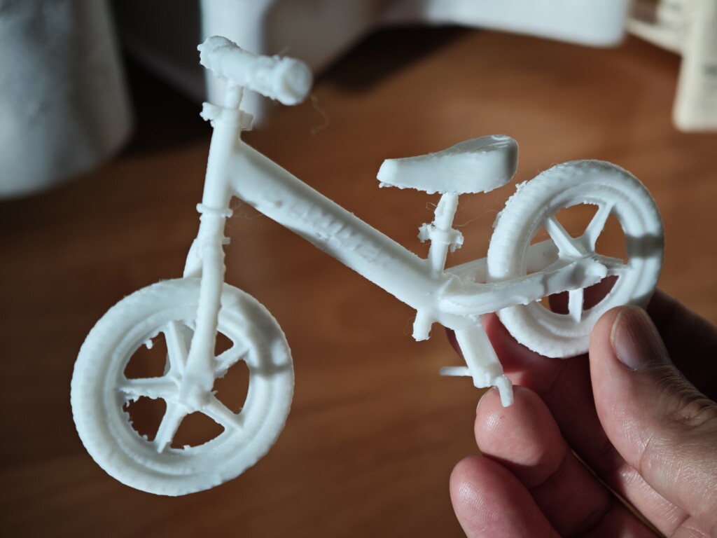 下のようなホイール部分の積層もきれいですし、タイヤ部分のファジースキンもいい感じに表現されています。また別の印刷では3Dスキャンしたストライダーの模型も印刷してみましたが細かい部分までしっかり印刷出来ています。サポートが無事に取れていることはこのフィラメントが一定の積層間強度とサポート分離性を持っていることの証かなと思います。