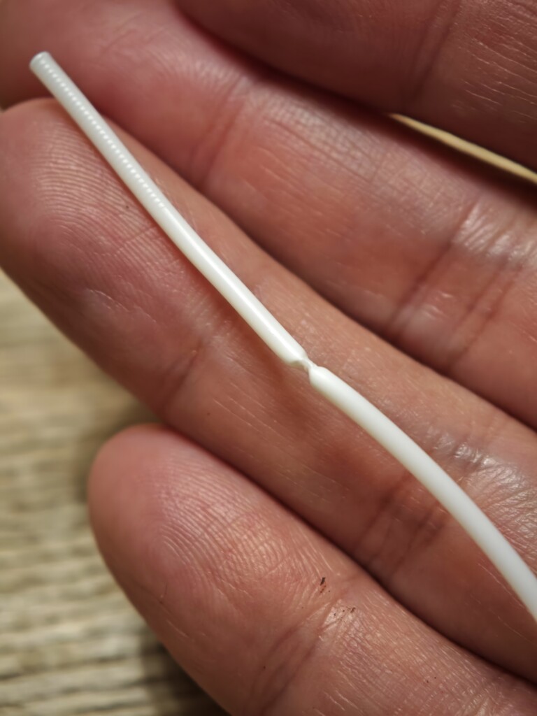 そして前回の轍を踏まないよう、おそらく折れにくくなっています。Snapmaker U1 やAD5Xなど経路が長い状態でも今のところぽっきり折れてはいません。フィラメントをぐいぐいと繰り返し折り曲げてみても、ポキッとざらっと、といった感じで折れず、写真のようなぐにょっとした感じで折れていきます。粘り気がある感じがわかる写真です(笑)。この辺りも+の所以なのかな・・・。