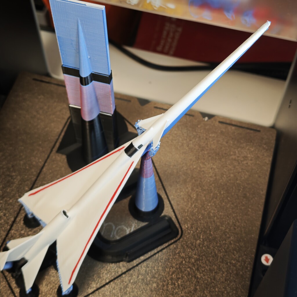 以前AD5Xでも印刷した怪獣もかわいく出来ますし、サポート剥離面もキレイに仕上がっています。1-4色、どの組み合わせでどう印刷しても不満は出ないと思います。位置合わせ精度が非常に高いです。飛行機のモデルはPolyterra PLAの白と青を使っていますが、背の高いタワーもトラブルなく印刷されました。(ビビッてブリム沢山つけましたが)