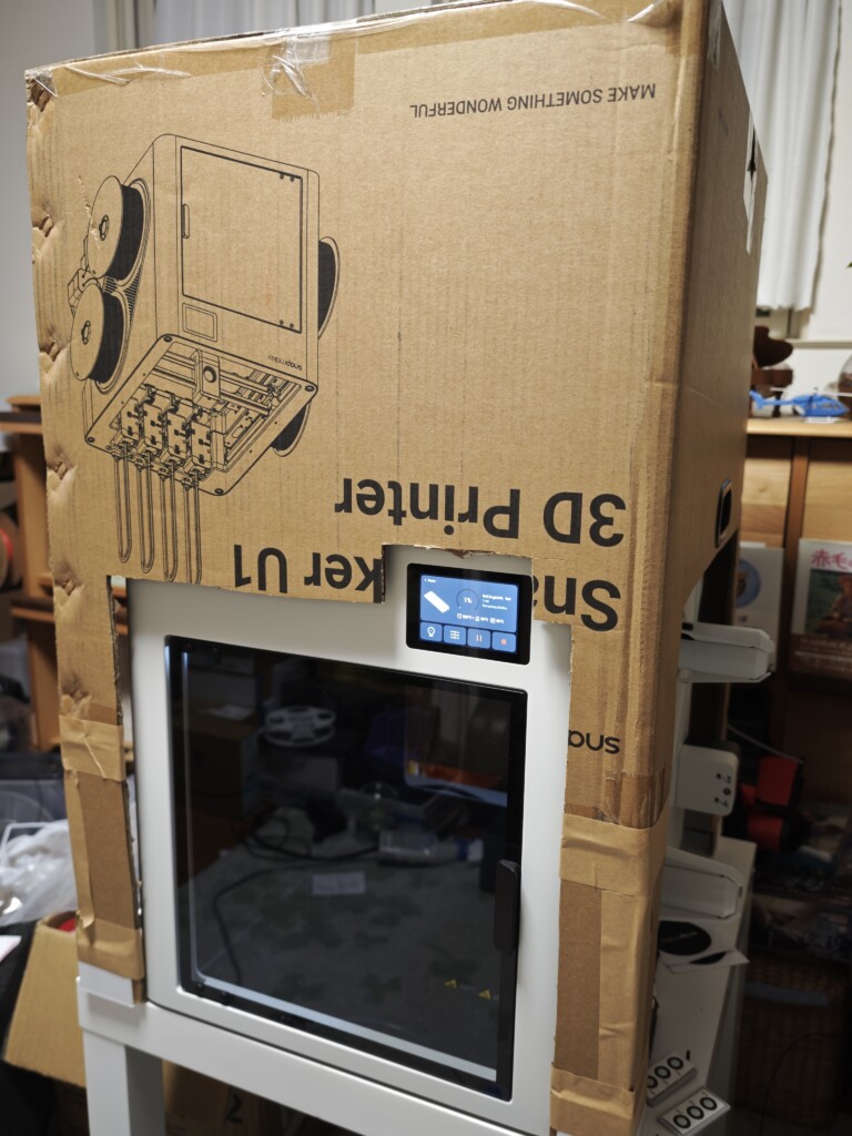 Snapmaker U1は後日発売されるトップカバーで筐体上面を覆うことでパッシブに50度程度の温度と簡易なエアフィルターの利用が可能になる予定です。当面PLA等メインになるかと思いきや、海外ニキが梱包段ボールを利用した簡易エンクロージャーを紹介していましたので私も作りました。じゃじゃーん。実はPLAでも寒い室内だと冷えすぎることがあり、長細いものだとエンクロージャーがあったほうが便利なんですよね・・・。