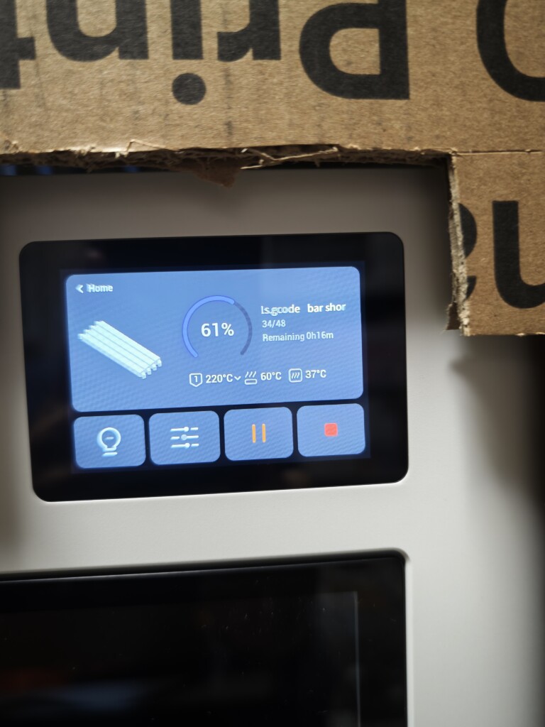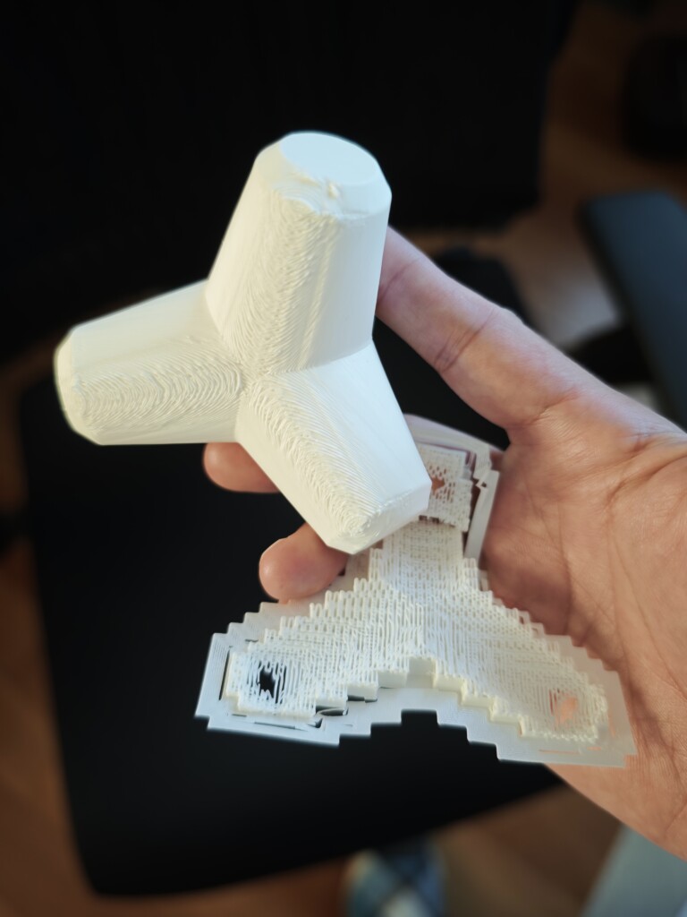 ポテンシャルとしては十分で不安感のない出来上がりです。これには安定した1stレイヤーと自動のフローキャリブレーションの影響が大きいと思います。まず前回もお話ししましたがマニュアルとオートレベリングが併用出来ることで1層目の定着に安心感があるんですよね。全面でかなり均一な定着です。まあ、最近の機種では当たり前であってほしい機能ですけれど。また、Bambuと同様のフローキャリブレーションも効果的で安定した吐出を生み出してくれています。初めて使うフィラメントでも印刷時にキャリブレーションをオンにすれば自動で測定してくれるの素晴らしいです。この機能はBambuとSnapmaker以外も各社標準装備してほしい(poopがつくられるのと、キャリブレーション時間が追加になります)。初めてのABSでも安心ですね。