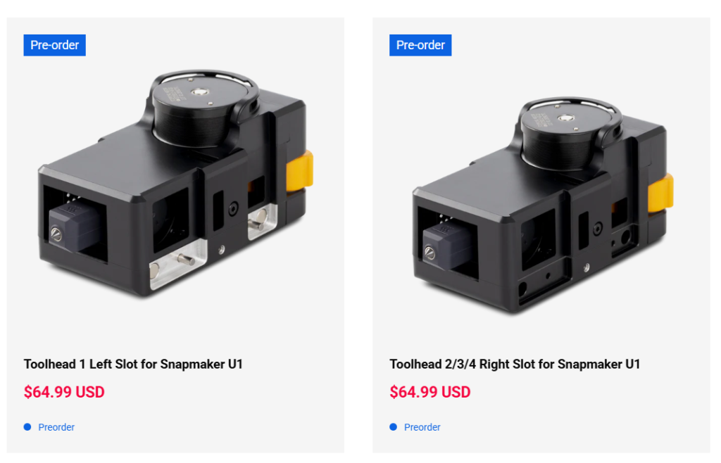 また持続性という意味ではノズルやエクストルーダー自体の値段もランニングコストとして効いてきます。シンプルなのはPRUSAですが、Snapmaker U1のツールも全部入りで65ドルと相当安いです。ノズル部分なら20ドル程度の予定みたいです。この辺りの価格面はまだ不透明なことも多いですので各社公式最新情報をご参照くださいね!なお、Snapmakerは既にストアで色々なものの販売が始まっています。以下はスクショですがこんな感じ。全体にリーズナブルな値段だと思います。