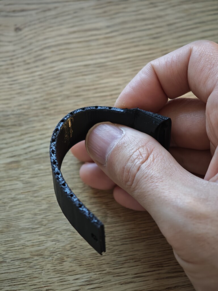 バンド素材は当初TPUを考えていましたが、ちょっと硬いですよね。寒くなると硬くなる点もあまり好きではなかったので別な素材に変更しました。いくつか試しましたが最終的にはSiraya TechさんのPEBA(ポリエーテルブロックアミド)にしました。まだ新しい素材でレビューも少ないですが、TPUの上位素材といっていいんじゃないかという印象を持っています。800gで8000円強とお値段も高いですが、よりしなやかで肌当たりも良いです。