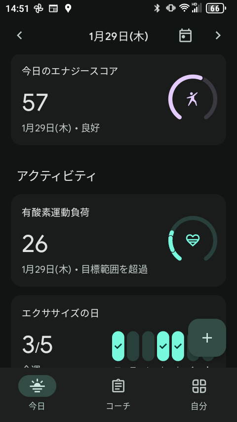 fitbitにもwenaと同様に専用アプリがあり、結構色々表示されます。今回はwena4(仮)を作る記事なのであまり触れませんが、運動や睡眠、心拍数や酸素飽和度の変動等いろいろ見てくれる感じです。