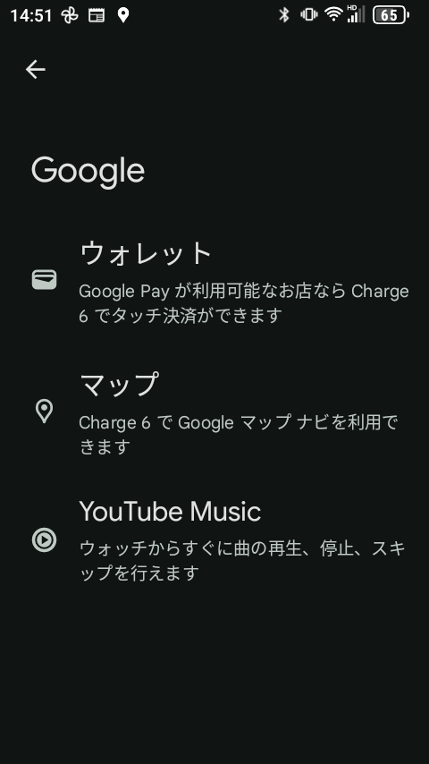 決済についてはこのアプリ上からGoogle payを選択して行います。スマホ側がFeliCaに対応している必要はなく、完全に独立した機能です。Google関連はほかにGoogleマップとYoutube musicの機能があります。逆に言えばそれ以外の音楽アプリの操作などは行えません。